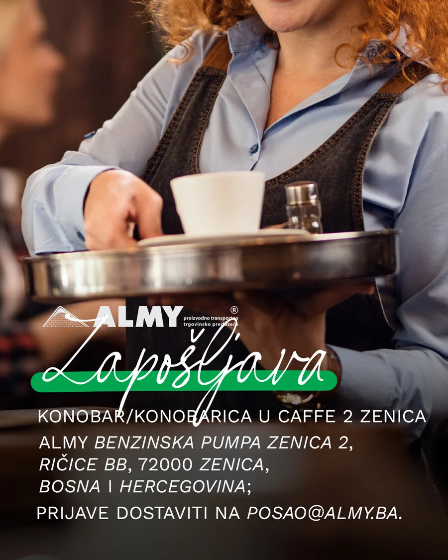 Kompanija Almy d.o.o. Zenica objavila je konkurs za prijem u radni odnos na poziciju konobara ili konobarice u objektu Caffe Zenica 2, koji se nalazi u sklopu benzinske pumpe Almy 2 u naselju Ričice.
