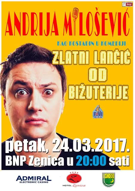 Andrija Milošević, trenutno jedan od najpopularnih glumaca u regiji, sa svojom monodramom “Zlatni lančić od bižuterije” već mjesecima puni dvorane širom regiona. Upravo sa ovom hit predstavom Andrija će 24. marta gostovati u Bosanskom narodnom pozorištu u Zenici.