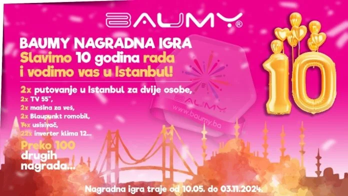 BAUMY slavi 10 godina rada i vodi vas u Istanbul. Učestvovati možete kupovinom BAUMY proizvoda u minimalnom iznosu od 50KM u Baucentrima ALMY ili kod BAUMY ovlaštenih distributera.