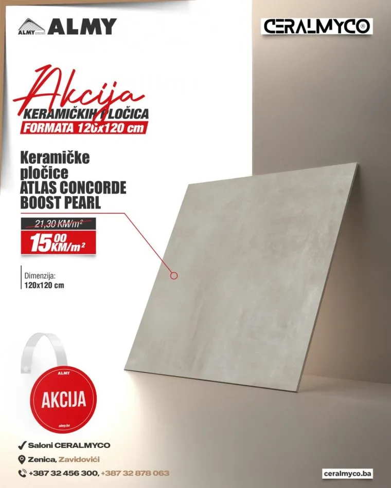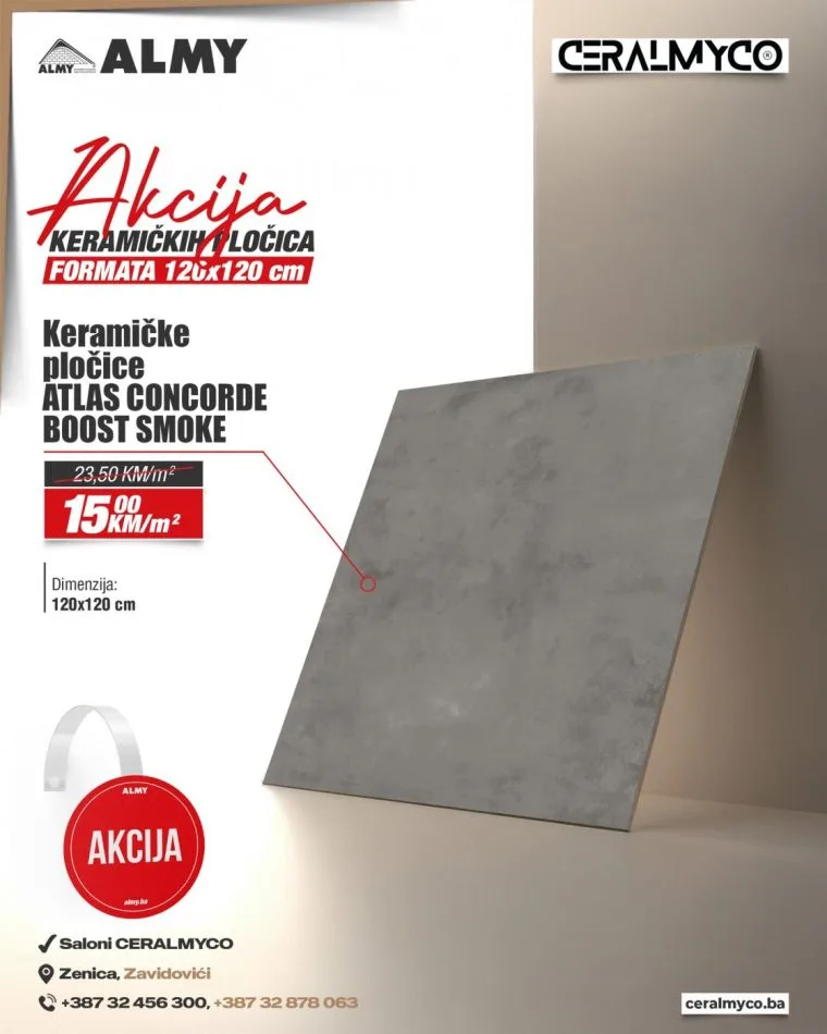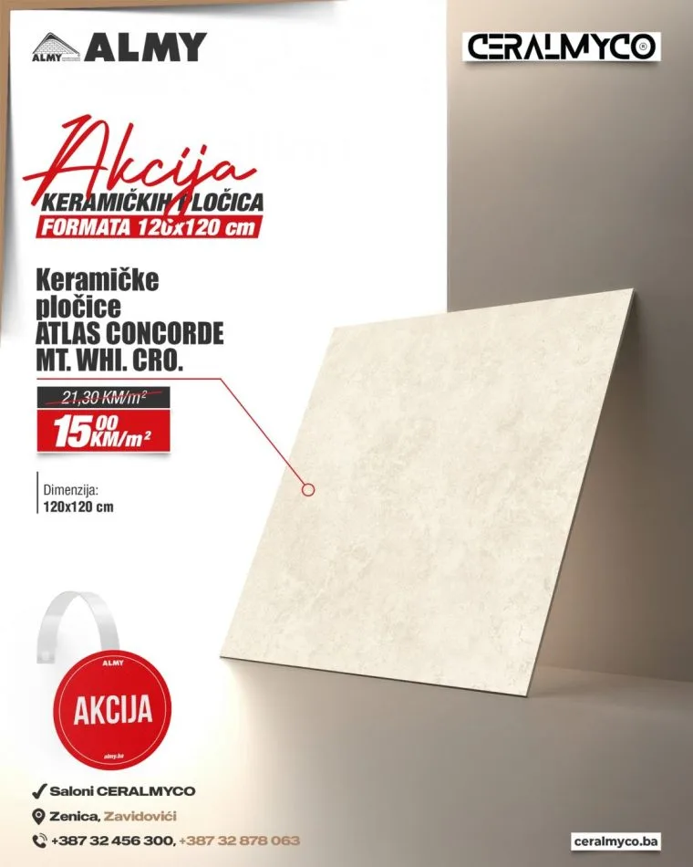 Saloni CERALMYCO u Zenici i Zavidovićima pripremili su posebnu akcijsku ponudu keramičkih pločica kvadratnog formata 120 x 120 cm, koje kombinuju vrhunski kvalitet i moderan dizajn po izuzetno povoljnim cijenama.