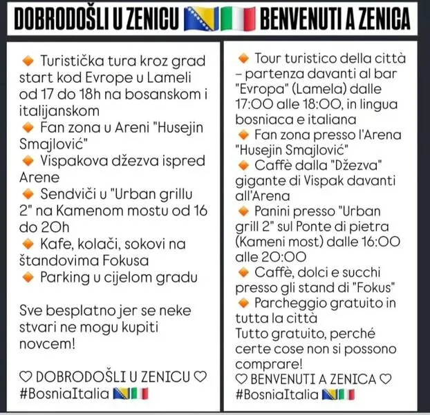 Planirana je turistička tura sa Afanom Abazovićem kroz Zenicu na bosanskom i italijanskom jeziku (od 17 do 18 sati), s polaskom kod “Evrope” u Lameli, dok će centralno okupljanje biti u fan-zoni u Areni “Husejin Smajlović”. Ispred Arene bit će postavljena Vispakova džezva, najveća na svijetu, a posjetiocima će biti dostupna kafa, kolači i osvježenje na štandovima.