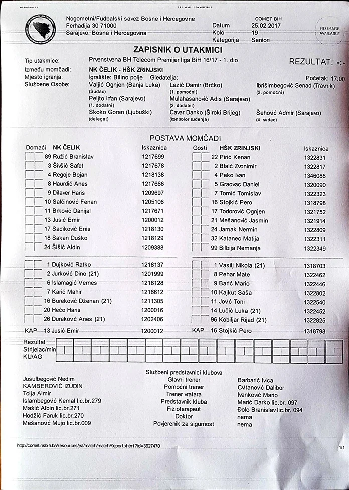 Spisak igrača koji će večeras igrati na stadionu Bilino polje u Zenici: