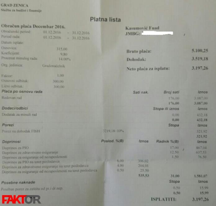 – Ta će plaća ostati ista i po novoj odluci. Ja kao gradonačelnik nisam mijenjao koeficijent svoje plaće i on je isti kao i ranije. Većina koeficijenata za ostale uposlenike je usklađena sa zakonom i nikome nije povećana plaća. Istina je da su neki imali koeficijente iznad zakonom propisanih pa smo to revidirali. Moja plaća je ista kao i od rahmetli gradonačelnika Smajlovića i takva će i ostati – navodi Kasumović koji je Faktoru poslao i platnu listu kao dokaz svojih tvrdnji.