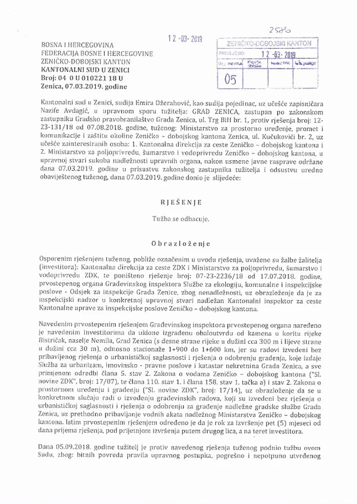 Gradsko pravobranilaštvo Zenica je 5. septembra prošle godine pokrenulo upravni spor, smatrajući da je u drugostepenom postupku došlo do bitnih povreda pravila upravnog postupka, pogrešno i nepotpuno utvrđenog činjeničnog stanja, te pogrešne primjene materijalnog prava.