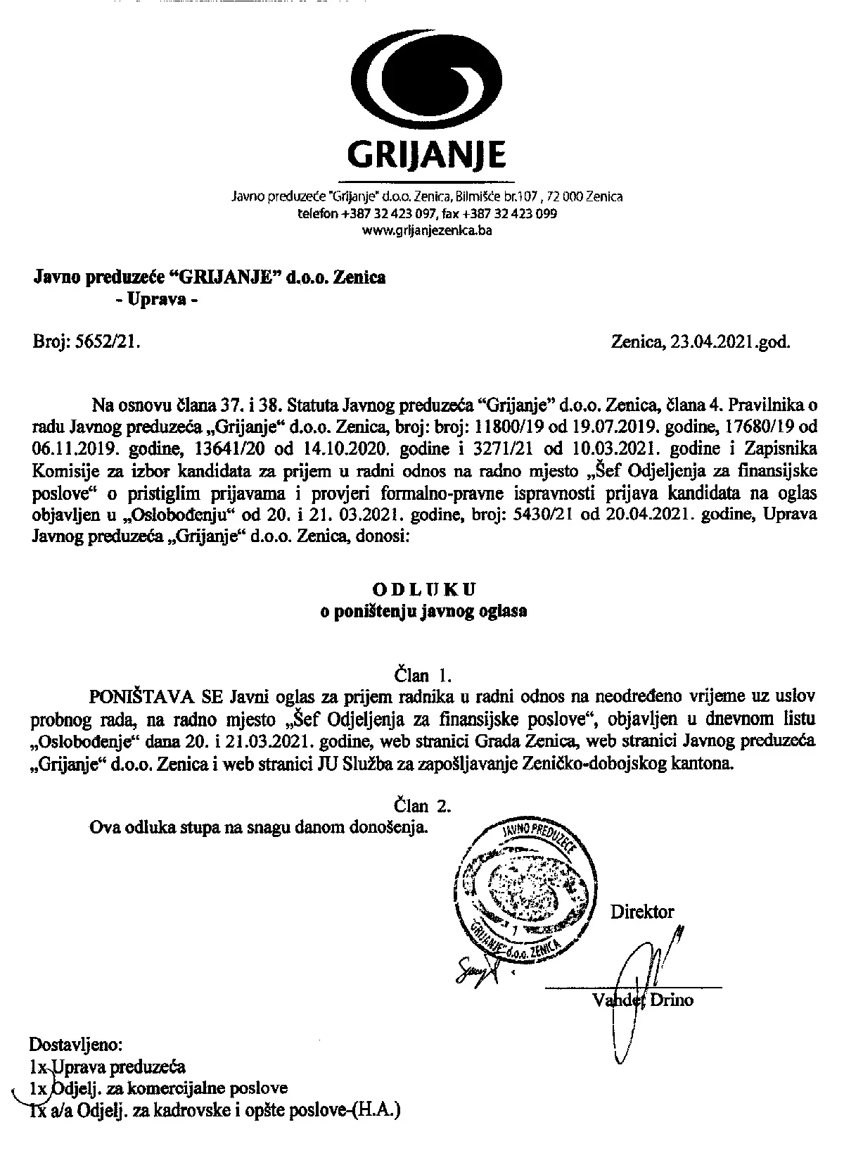 U petak, 23. aprila 2021. godine, direktor ovog javnog preduzeća Vahdet Drino je poništio raspisani javni oglas za prijem radnika na neodređeno.