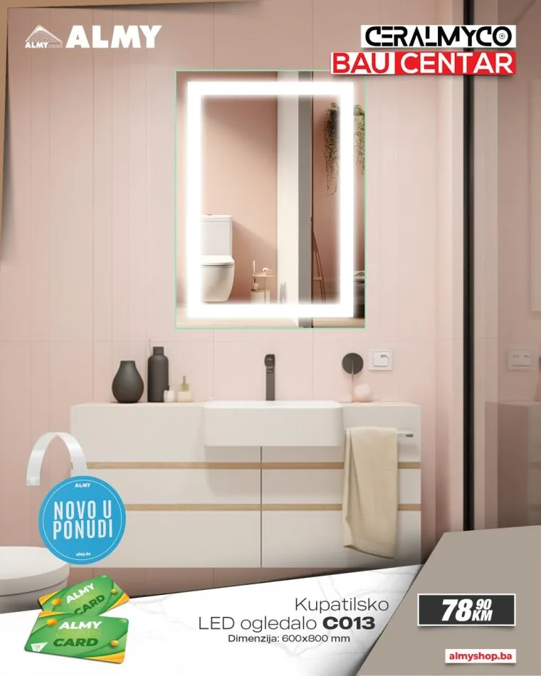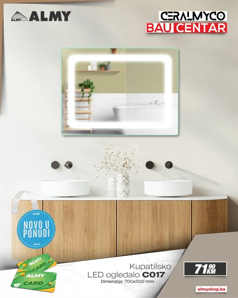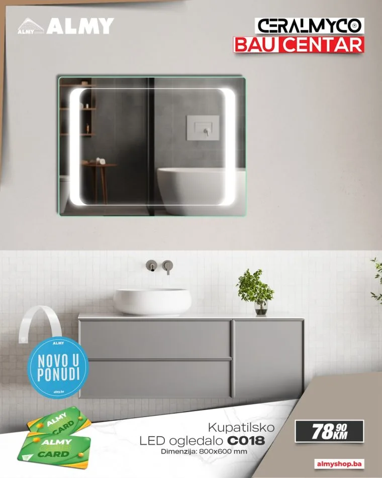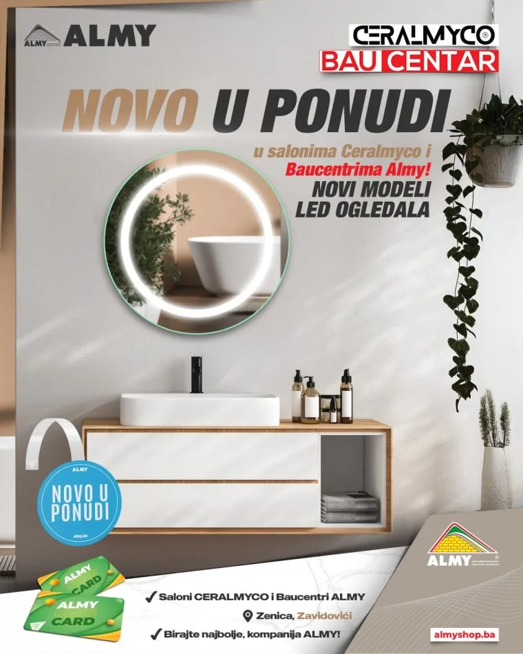 Ljubitelji modernog dizajna i funkcionalnog uređenja kupatila imaju novu priliku za osvježenje prostora! U salonima Ceralmyco i baucentrima ALMY u Zenici i Zavidovićima stigli su novi modeli LED ogledala vrhunskog kvaliteta, dostupni po izuzetno povoljnim cijenama.