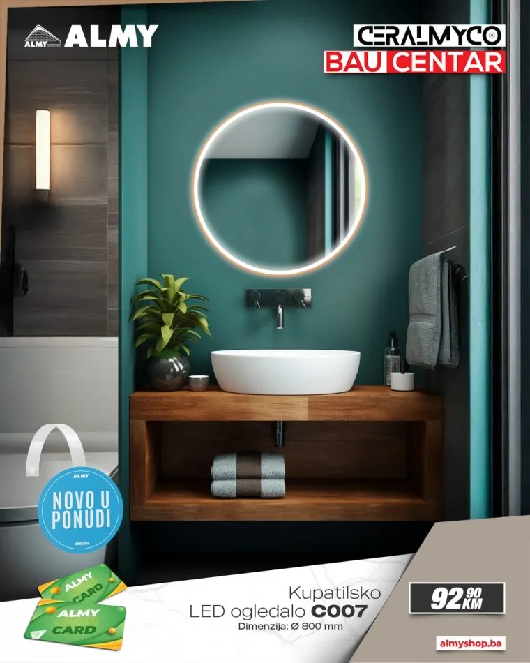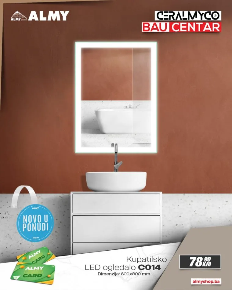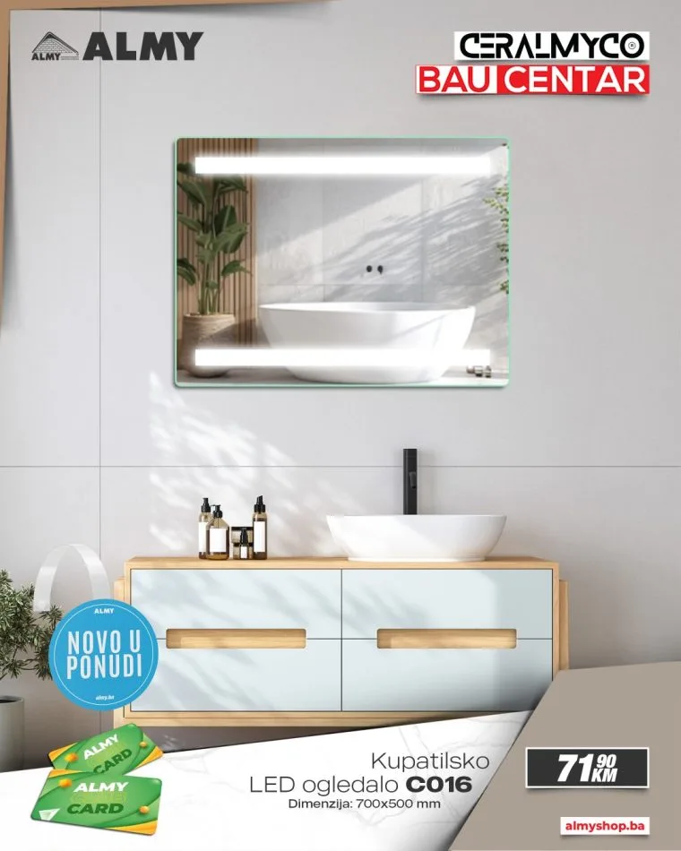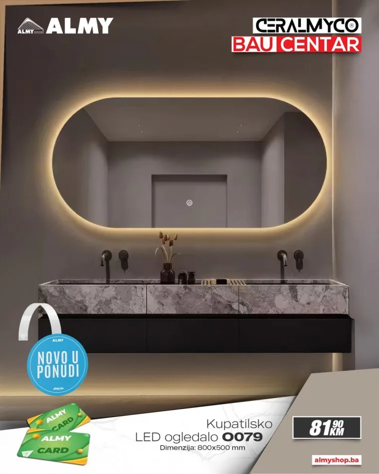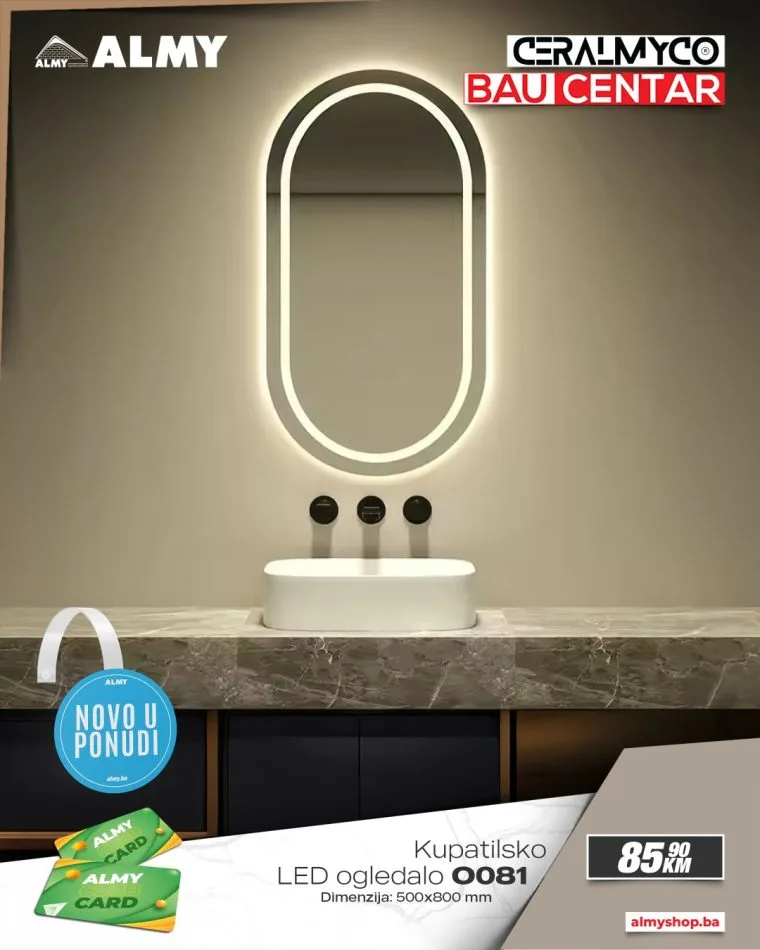Ljubitelji modernog dizajna i funkcionalnog uređenja kupatila imaju novu priliku za osvježenje prostora! U salonima Ceralmyco i baucentrima ALMY u Zenici i Zavidovićima stigli su novi modeli LED ogledala vrhunskog kvaliteta, dostupni po izuzetno povoljnim cijenama.