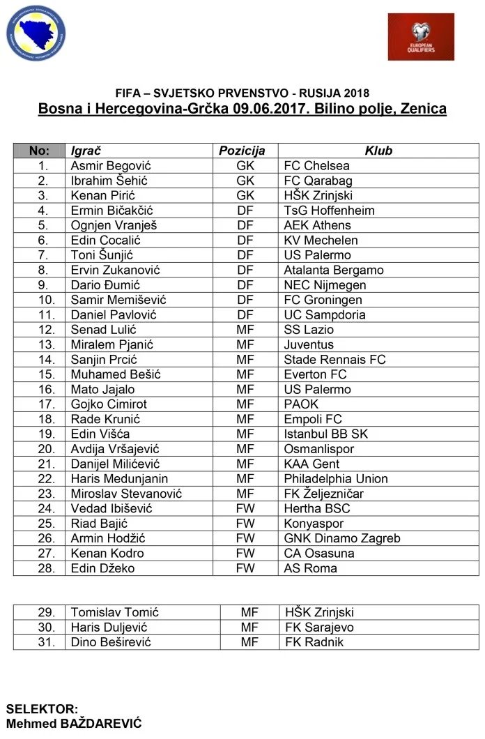 “A” selekcija će se 9. juna na “Bilinom polju” sastati sa Grčkom, a selektor Baždarević je pozvao 28 igrača, a na dodatnom spisku su još tri, Tomić, Duljević i Beširević koji će dobiti poziv u slučaju povreda.
