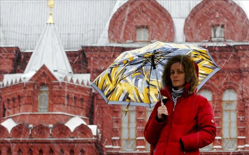 Objektiv fotoreportera Anadolu Agency zabilježio je trenutnu situaciju na ulicama Moskve i građane obučene u zimsku odjeću i s kišobranima u rukama.
