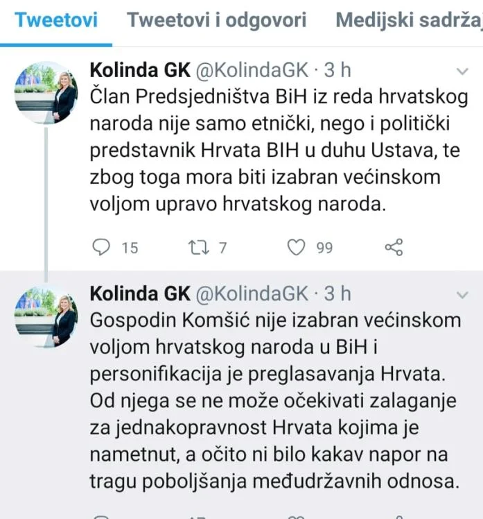 “Komšić mora shvatiti da je ne samo etnički, nego i politički predstavnik hrvatskoga naroda”, izjavila je hrvatska predsjednica i tako su mediji u Hrvatskoj i u BiH prenijeli njenu izjavu.