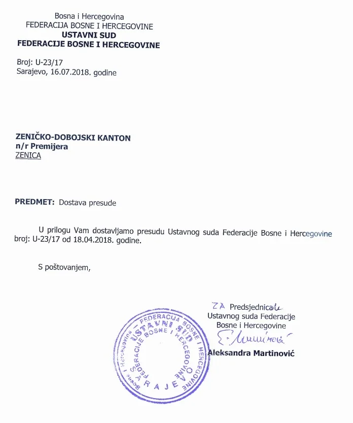 Ured premijera Zeničko-dobojskog kantona dana 18.07.2018. godine zaprimio je Presudu Ustavnog suda Federacije BiH, br. U-23/17 od 18.04.2018. godine, kojom se utvrđuje da Odluka o izmjenama i dopunama Odluke o komunalnim taksama Grada Zenice (Službene novine Grada Zenice broj 1/17), nije u skladu sa Ustavom FBiH.