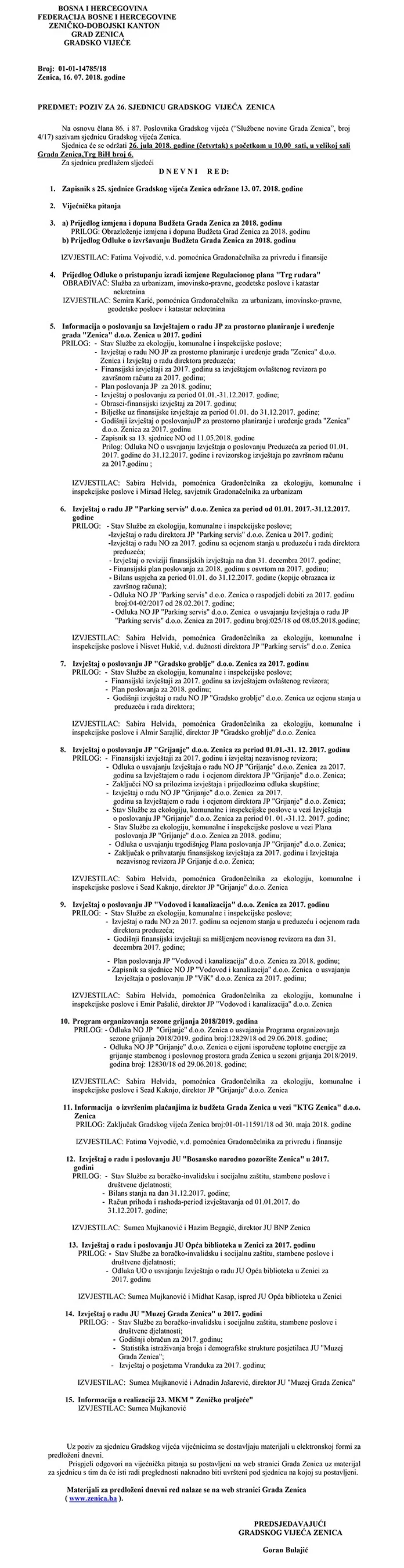 Sjednica Gradskog vijeća Grada Zenice, 26. po redu, zakazana je za četvrtak, 26. juli 2018. godine, s početkom u 10 sati u velikoj sali Grada Zenica, Trg BiH broj 6.