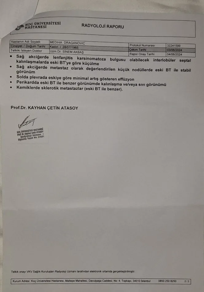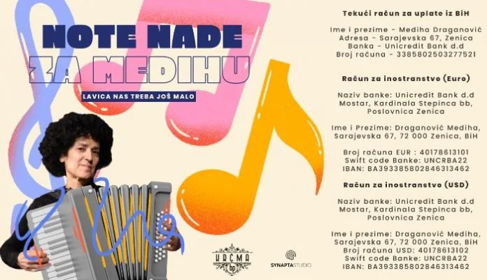 “Prema Medihinim riječima, tzv. pametne terapije zasad pozitivno djeluju, jer nalazi kontrolnog snimanja CT pluća i MRI abdomena pokazuju da je bolest pod kontrolom. Ipak, umjesto prvobitno planiranih 6 terapija, s koliko se predviđalo potpuno izlječenje bolesti, doktorski tim na Koc University Hospital preporučio je još dodatne dvije terapije, što sada čini ukupno njih 8. Zahvaljujući dobrim ljudima, Mediha trenutno raspolaže sredstvima za još tri naredne terapije, ali za ove dodatne 2 nema pokrića, zbog čega se apel za pomoć ponovo pokreće. Svaka njena terapija košta oko 6000 EUR-a, što s troškovima putovanja te smještaja u prosjeku iznosi oko 15.000 KM. Stoga, ponovo objavljujemo Medihine račune na koje se mogu uplaćivati prilozi te u istu svrhu postavljamo humanitarnu kutiju u našem objektu Krčma BP. Molimo vas da opet dijelite ovu objavu na vašim fb profilima, kako bi vijest o ponovnom pokretanju apela za pomoć došla do što više ljudi, na čemu se u Medihino i naša imena od srca zahvaljujemo te ponovo pozivamo sva uduženja, javne institucije, estradne umjetnike, privrednike i ostale da se uključe u akciju u što većem broju”, kazao nam je Ivan Petrović