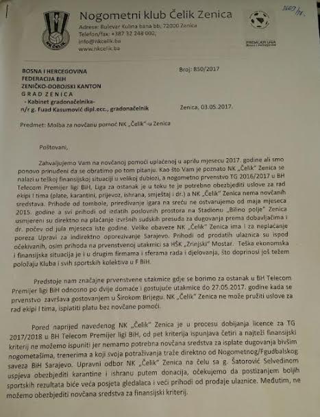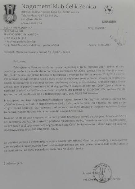U nadi da će se to što prije desiti i da ćemo pravovremeno početi razgovore na ovu važnu temu, želim svoje sugrađane i navijače NK Čelik informisati, kako se među mnoštvom krivih navoda koje slušamo ovih dana od raznoraznih “spasilaca” Čelika, potkrala i ona koja govori o tome koliko je Grad Zenica uplatio za osiguranje licence za Čelikovo takmičenje. Kako se može vidjeti u dokumentima koji su prilog moje reakcije, Gradonačelnik Fuad Kasumović potpisao je samo u maju dva zaključka, kojim se na molbe iz NK Čelik za dobijanje licence od 03. maja 2017. godine odgovorilo uplatom 70.000 KM, odnosno 23. maja 2017. godine uplatom 77.000 KM. U oba slučaja u zahtjevima se spominjala hitnost uplate zbog licenciranja, što znači da je za licenciranje iz gradskog budžeta uplaćeno 147.000 KM.