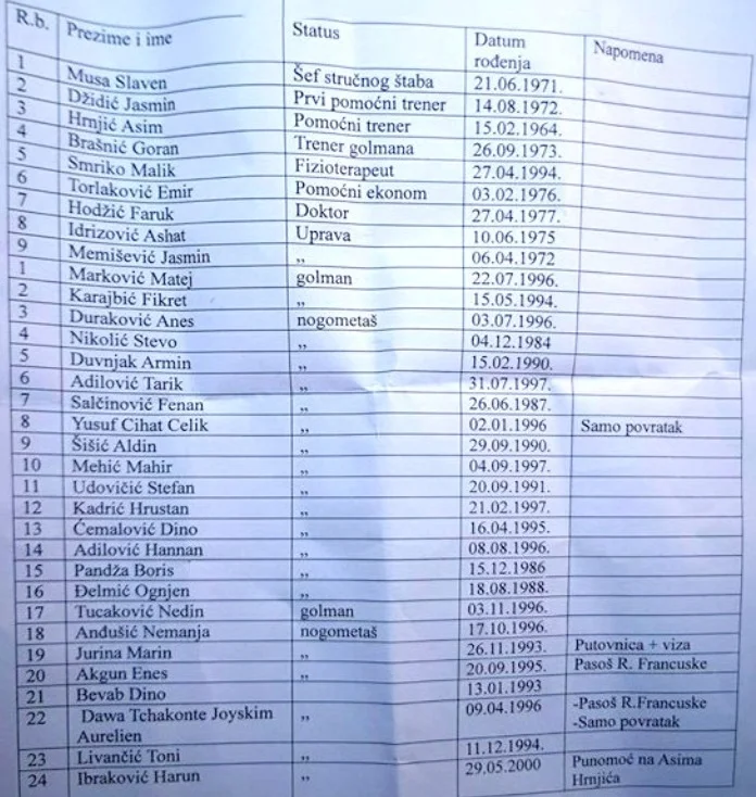 Na pripremama u Antaliji su šef stručnog štaba Slaven Musa sa pomoćnicima Jasminom Đidićem, Asimom Hrnjićem i Goranom Brašnićem, doktor Faruk Hodžić, terapeut Malik Smriko, ekonom Emir Torlaković, golmani Matej Marković, Fikret Karajbić, Nedin Tucaković, nogometaši Duvnjak Armin, Adilović Tarik, Salčinović Fenan, Duraković Anes, Šišić Aldin, Mehić Mahir, Udovičić Stefan, Kadrić Hrustan, Ćemalović Dino, Adilović Hannan, Boris Pandža, Harun Ibraković, Stevo Nikolić, Anđušić Nemanja, Jurina Marin, Akgun Enes, Dino Bevab, Ognjen Đelmić, Toni Livančić, Yusuf Cihat Celik, Joyskim Aurelien Dawa Tchakonte.