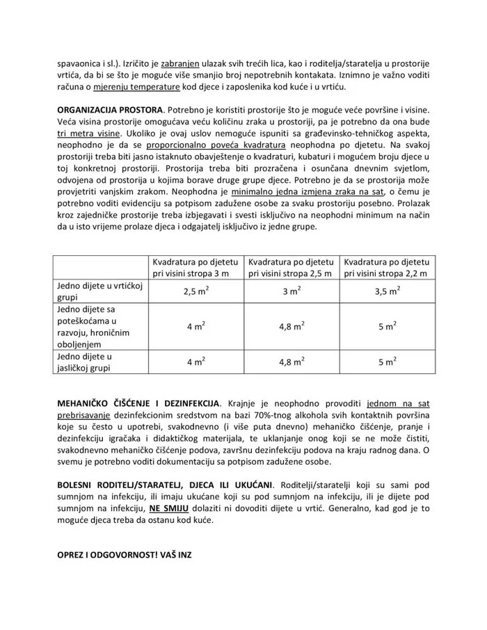 U novim procedurama, koje se odnose na organizaciju rada sa djecom, kao i organizaciju prostora, se navodi da jedna grupa može brojati maksimalno 15 osoba, te da je potrebno obezbijediti najmanje 2,5 m2 za svako dijete. Upravo ova naredba će stvoriti nove probleme vrtićima, obzirom da će se najvjerovatnije morati smanjiti broj djece, ali kako i na koji način će se vršiti selekcija ko može, a ko ne može ići u vrtić, za sada nije poznato.