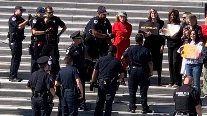 Glumica (81) je sa grupom demonstranata protestovala u okviru svoje kampanje pod nazivom “Fire Drill Friday” (Protivpožarni petak). Policija sa Capitol Hilla rekla je za CBS da je uhapšeno 16 osoba pod optužbama za ometanje dnevnog reda.