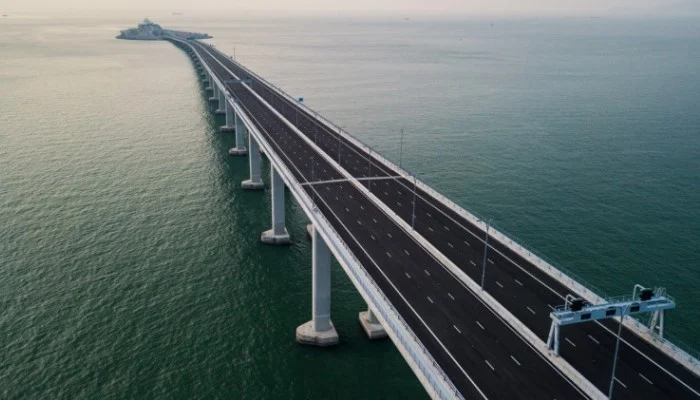 U toj infrastrukturi dugoj 55 kilometara izmjenjuju se dug cestovni most, koji vijuga iznad voda delte Biserne rijeke, i podmorski tunel.