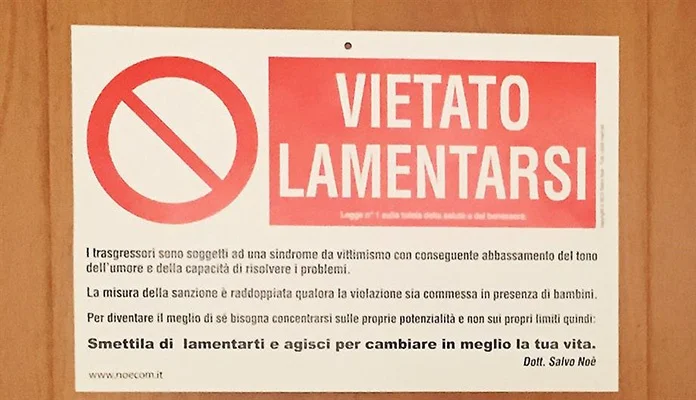 Na talijanskom jeziku i slovima u crveno-plavoj boji piše da “prekršitelji pate od sindroma stalnog osjećaja žrtve, kao i od manjka humora te sposobnosti rješavanja problema”.