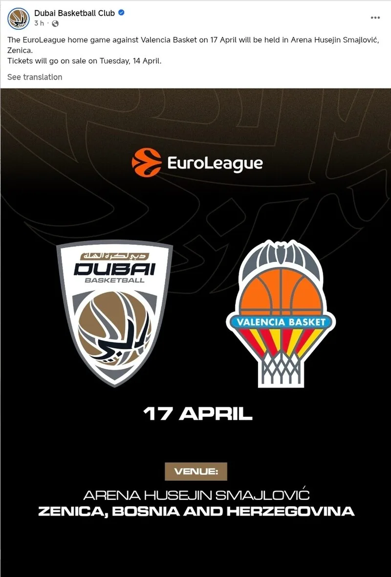Podsjetimo, kako je ranije objavio Radio Zenit, Dubai je bio primoran izmjestiti domaće utakmice zbog situacije na Bliskom istoku, a prvobitni plan bio je da se meč protiv Valencije igra u Sarajevu. Međutim, zbog zauzetosti dvorana Zetra i Skenderija, koje su u terminu od 16. do 19. aprila rezervisane za sajam namještaja, izbor je pao na Zenicu.