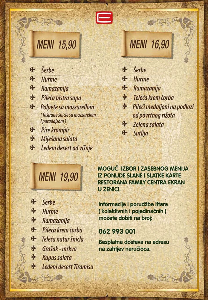 Informacije i narudžbe iftara, kako kolektivnih tako i pojedinačnih, možete dobiti pozivom na broj telefona 062 993 001.