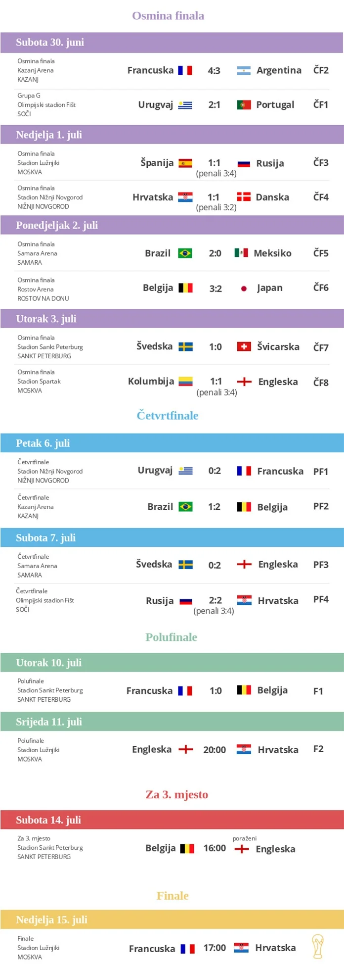Hrvatska će u nedjelju od 17 sati igrati veliko finale protiv Francuske, dok će se dan ranije u Sankt Peterburgu sastati Belgija i Engleska u meču za treće mjesto.