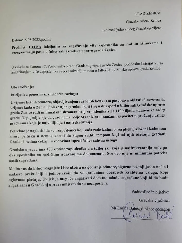 Vijećnica Gradskog vijeća Grada Zenica, Emina Babić, uputila je hitnu inicijativu kako bi se unaprijedila usluga koju Gradska uprava pruža svojim građanima. Cilj ove inicijative je angažovanje većeg broja zaposlenika za rad sa strankama u šalter sali Gradske uprave, kako bi se smanjili redovi i čekanja te omogućila efikasnija i brža komunikacija sa građanima.