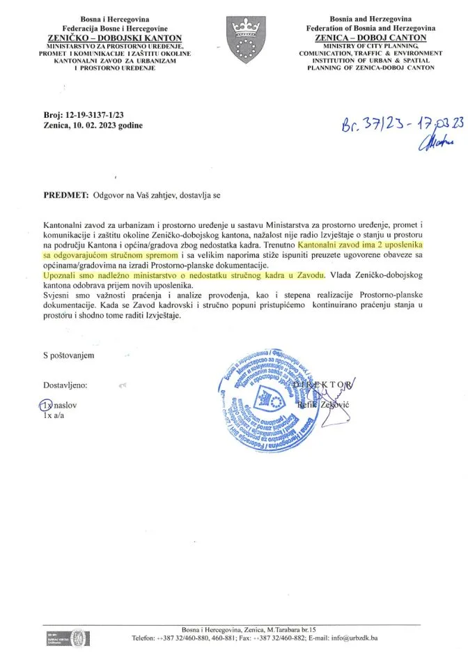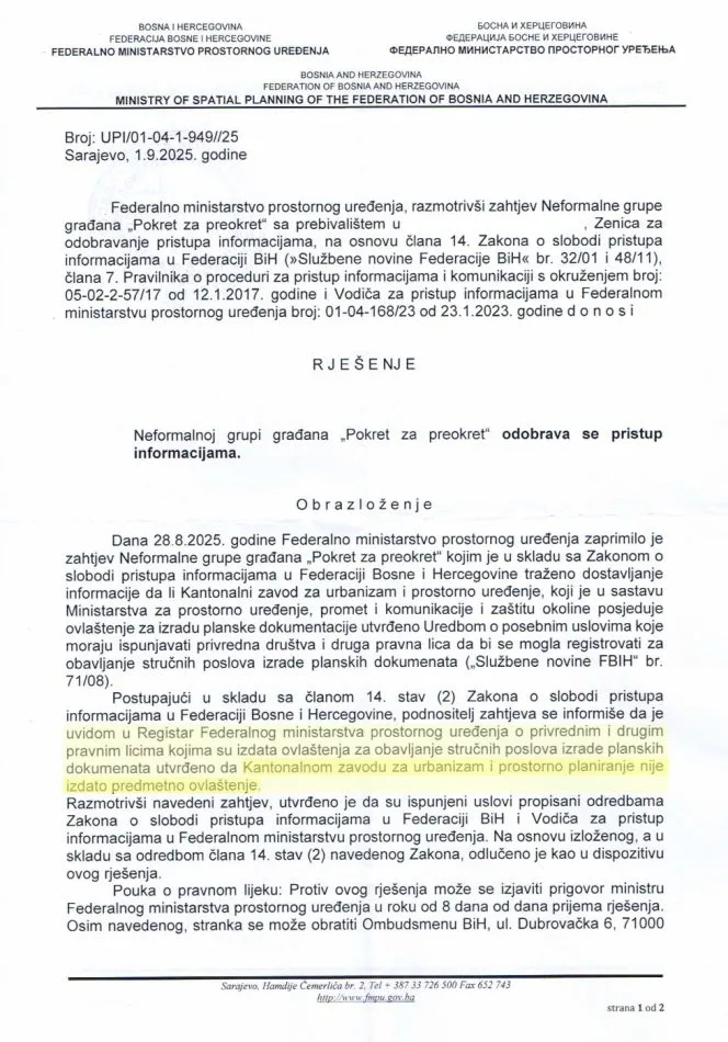 Dodatno, Kantonalni zavod za urbanizam – nosilac izrade – prema tvrdnjama Pokreta za preokret ne ispunjava ni minimalne zakonske kriterije za obavljanje tih poslova. Federalno ministarstvo, kako navode, u dopisu je potvrdilo da Zavod nije registrovan u skladu s propisanim uvjetima.
