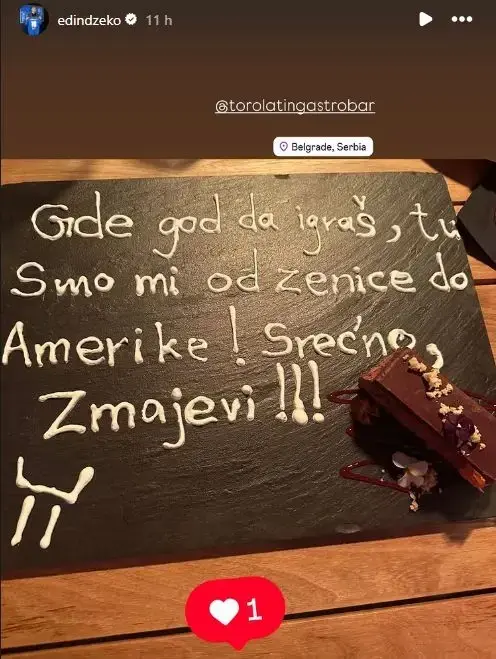 “Gdje god da igraš, tu smo mi od Zenice do Amerike! Sretno, Zmajevi”, objavio je Džeko beogradsku poruku.