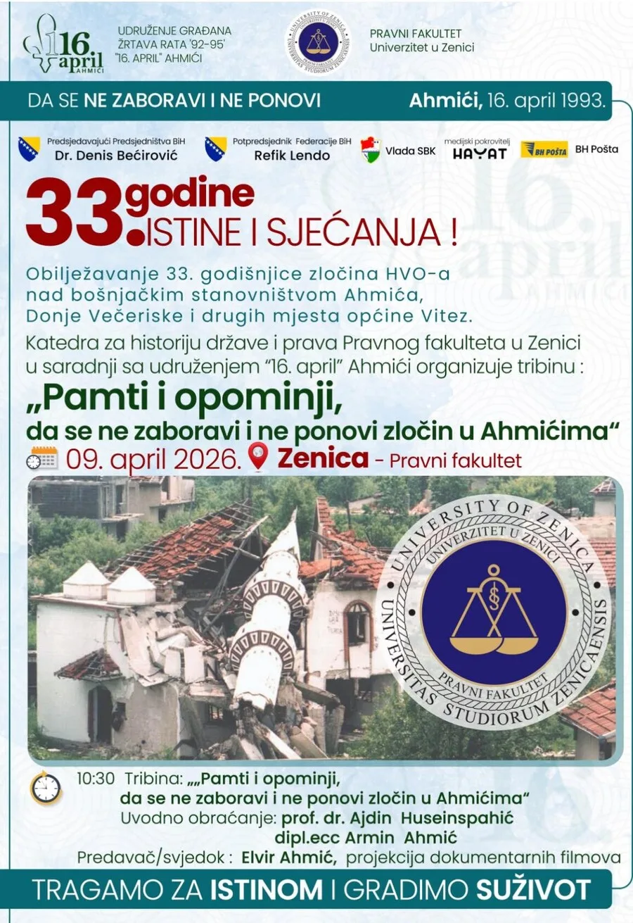 U okviru obilježavanja 33. godišnjice zločina nad bošnjačkim stanovništvom Ahmića, Donje Večeriske i drugih mjesta općine Vitez, u Zenici će u četvrtak, 9. aprila 2026. godine, biti održana javna tribina pod nazivom “Pamti i opominji, da se ne zaboravi i ne ponovi zločin u Ahmićima”.