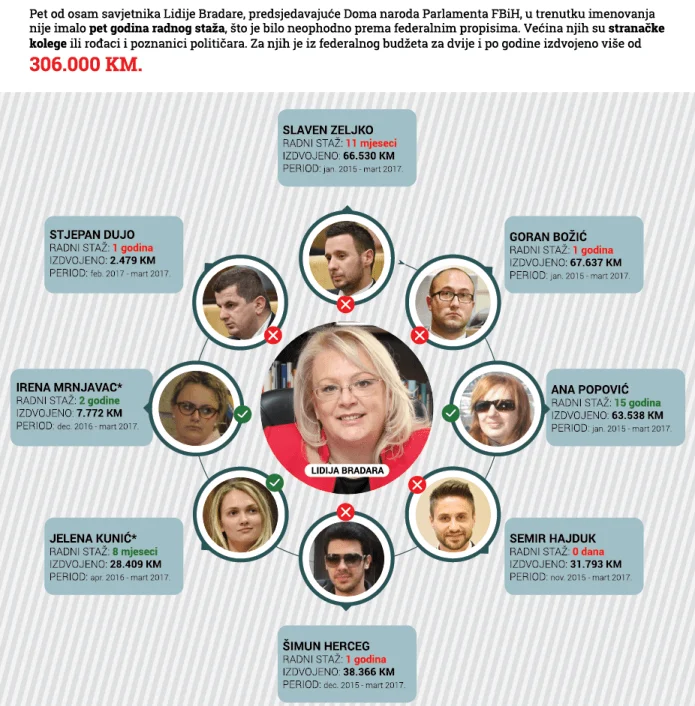 Pet od osam savjetnika koje je imenovala Lidija Bradara, predsjedavajuća Doma naroda PFBiH, nisu imali pet godina radnog iskustva kako predviđaju federalni propisi. Većina savjetnika su članovi vodećih stranaka, njihova rodbina ili poznanici.