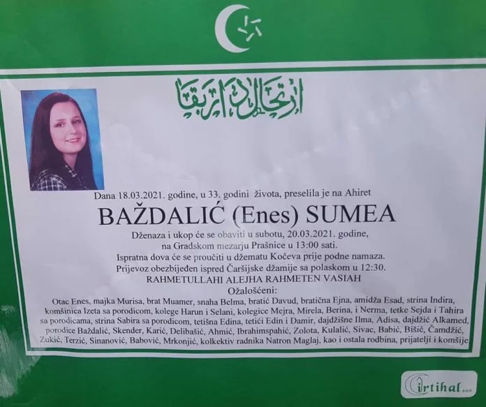 U Zenici je u četvrtak preminula naša tridesettrogodišnja sugrađanka Sumea Baždalić, objavili su administratori na fanpageu Plivačkog kluba Željezara Zenica.