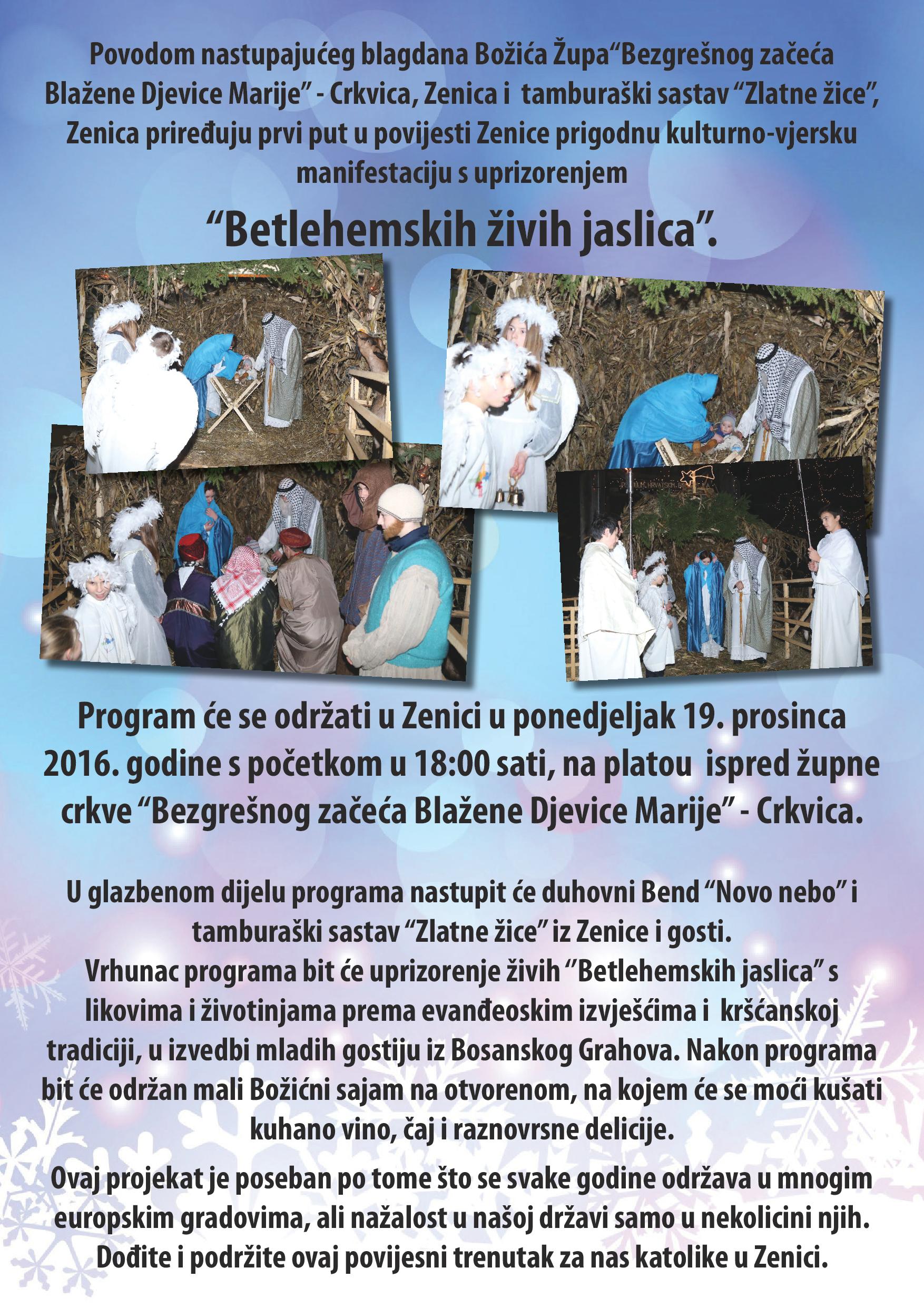 U glazbenom dijelu programa nastupit će duhovni zenički bend “Novo nebo” i tamburaški sastav “Zlatne žice”. Glavni dio programa činit će uprizorenje živih Betlehemskih jaslica s likovima i životinjama prema evanđeoskim izvješćima i kršćanskoj tradiciji, u izvedbi gostiju iz Bosanskog Grahova.