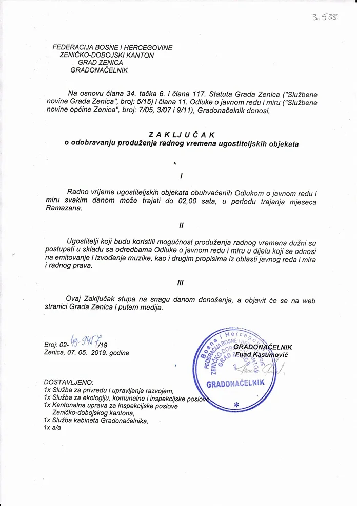 Gradonačelnik Zenice Fuad Kasumović potpisao je i ove godine Zaključak o odobravanju produženja radnog vremena ugostiteljskih objekata tokom mjeseca Ramazana.