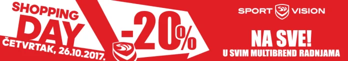 Samo u četvrtak 26.10.2017. očekuje vas 20% popusta na sve artikle u svim Sport Vision multibrend radnjama širom Bosne i Hercegovine.