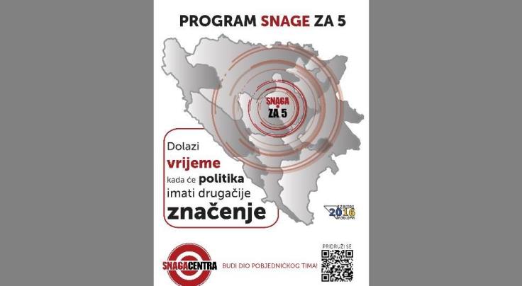 Dragi sugrađani, obzirom da dolazi vrijeme kada će politika imati drugačije značenje, predstavljamo Vam Program Snage za 5, Snage centra. Novi politički subjekte u BIH, orjentiran ka Gradu Zenica, kojeg čine mladi, ali iskusni iz svh oblasti ljudskog stvaralaštva, priredio je Program za 5, Jedini vodič za svjetliju budućnost.