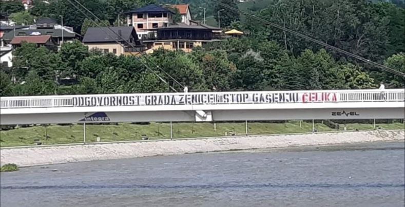 “Odgovornost grada Zenice – Stop gašenju Čelika”, stoji u poruci koja je osvanula na jednom od mostova Zenice.