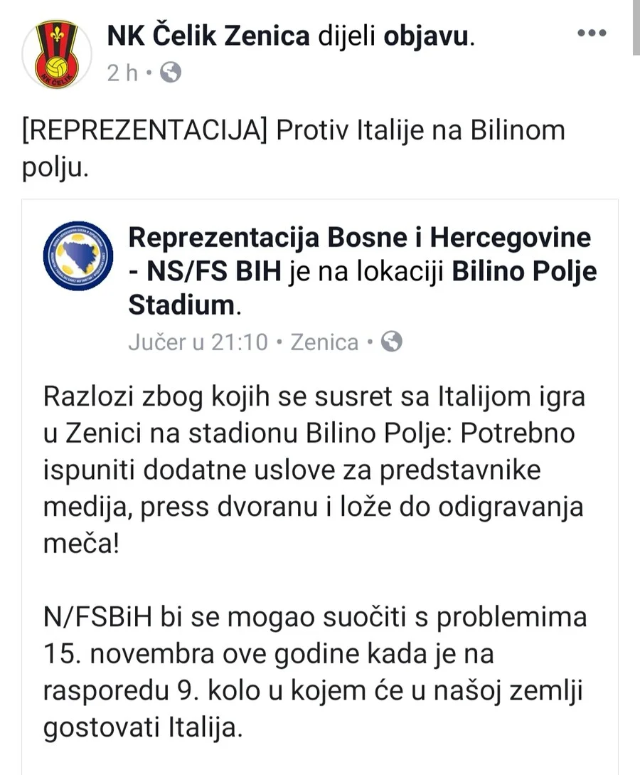 S obzirom na to da zenički “hram fudbala” ima veći kapacitet za press tribinu i bolje uvjete za mix zonu, gotovo je sigurno da će se na ovom stadionu doraditi i nedostaci, te da ćemo protiv Italije igrati na Bilinom Polju.
