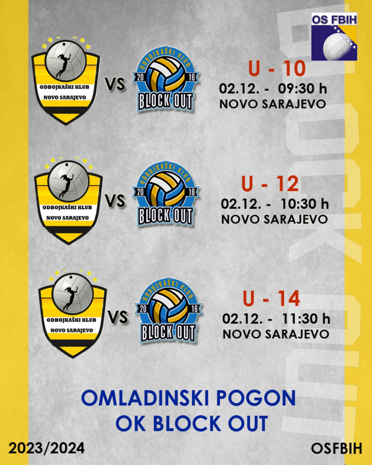 Danas će mlade odbojkašice zeničkog kluba “Block out” igrati tri utakmice protiv OK “Novo Sarajevo”.