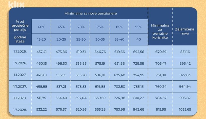 Npr: Ukoliko ste ostvarili pravo na minimalnu penziju, a imate između 15 i 20 godina radnog staža, dobijat ćete 60 posto od prosječne penzije u tom trenutku, a ako imate iznad 40 godina radnog staža, dobijat ćete 95 posto od prosječne penzije. U tabeli je detaljno prikazan obračun postotaka.