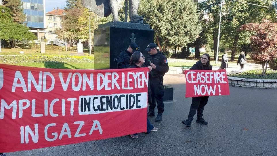 Dok je trajao sastanak predsjednice Evropske komisije Ursule von der Leyen s članovima Predsjedništva Bosne i Hercegovine – Željkom Cvijanović i Denisom Bećirovićem, ispred zgrade se okupila manja grupa aktivista s transparentima: “EU i Von der Leyen saučesnici u genocidu u Gazi”.
