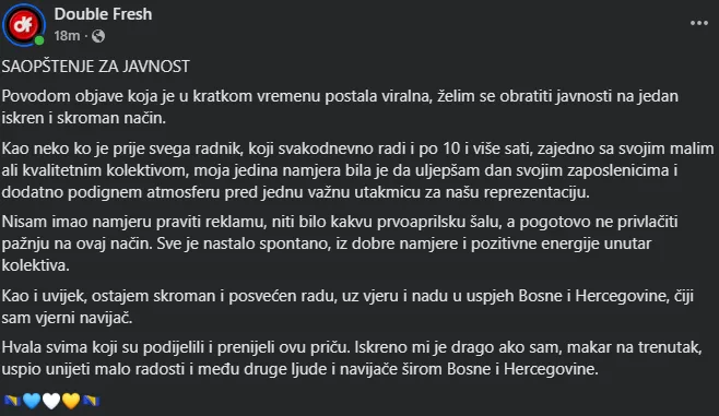 Na društvenim mrežama, firma je objavila obavijest koja je brzo postala viralna. U Instagram priči, uz zastavu Bosne i Hercegovine, istaknuli su: “Rad u firmi gdje su emocije prema reprezentaciji dio ugovora”.