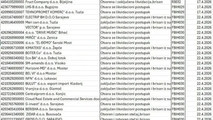 Likvidacioni postupak otvoren je u firmama LHS-B Bugojno, Tehnopromet komerc Tuzla, Drive music, El-Đemo Sanski Most, Boter Co.