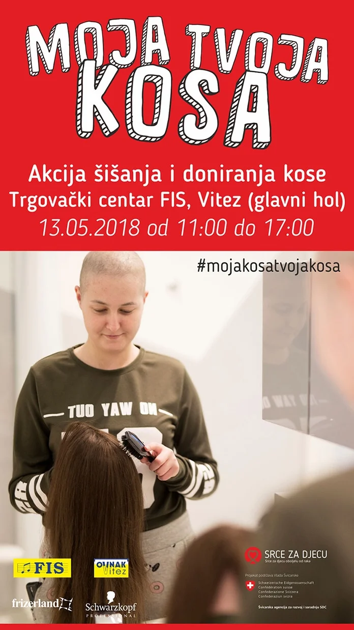 Udruženje ”Srce za djecu oboljelu od raka” organizira akciju šišanja i doniranja kose za potrebe izrade perika za djecu oboljelu od raka pod nazivom ”Moja kosa – tvoja kosa”.
