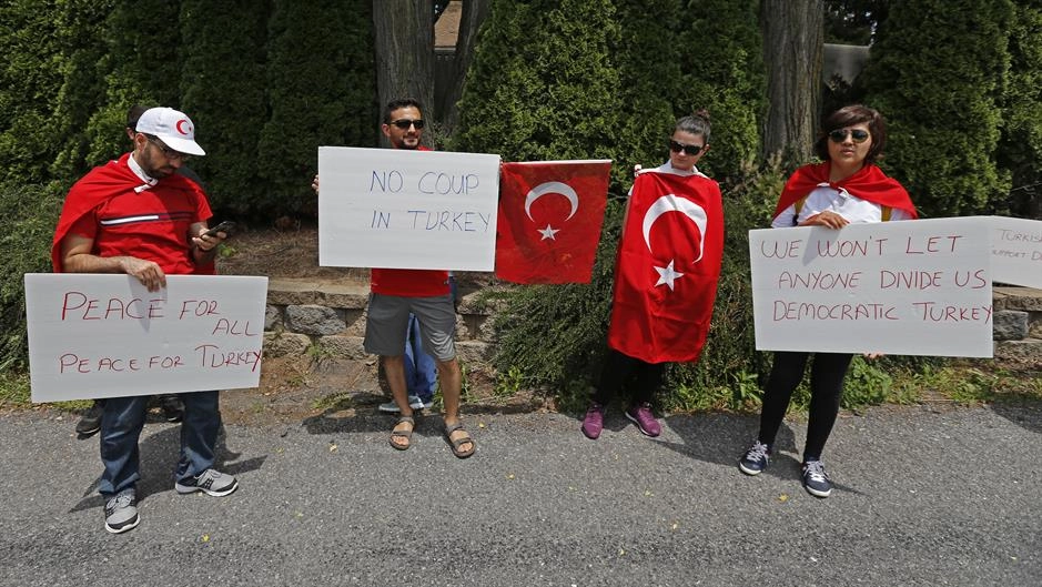 Grupa od oko 100 Turaka nastanjenih u SAD-u jučer je u Pensilvaniji protestirala protiv pokušaja državnog udara koji su izveli pripadnici turske vojske odani terorističkoj grupi FETO/PDY na čijem čelu je Fetullah Gulen koji živi u egzilu u Pensilvaniji.