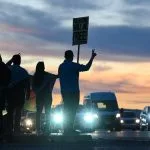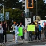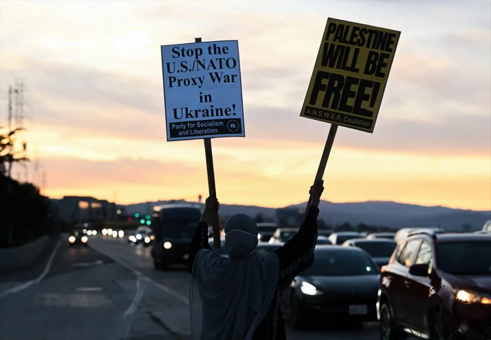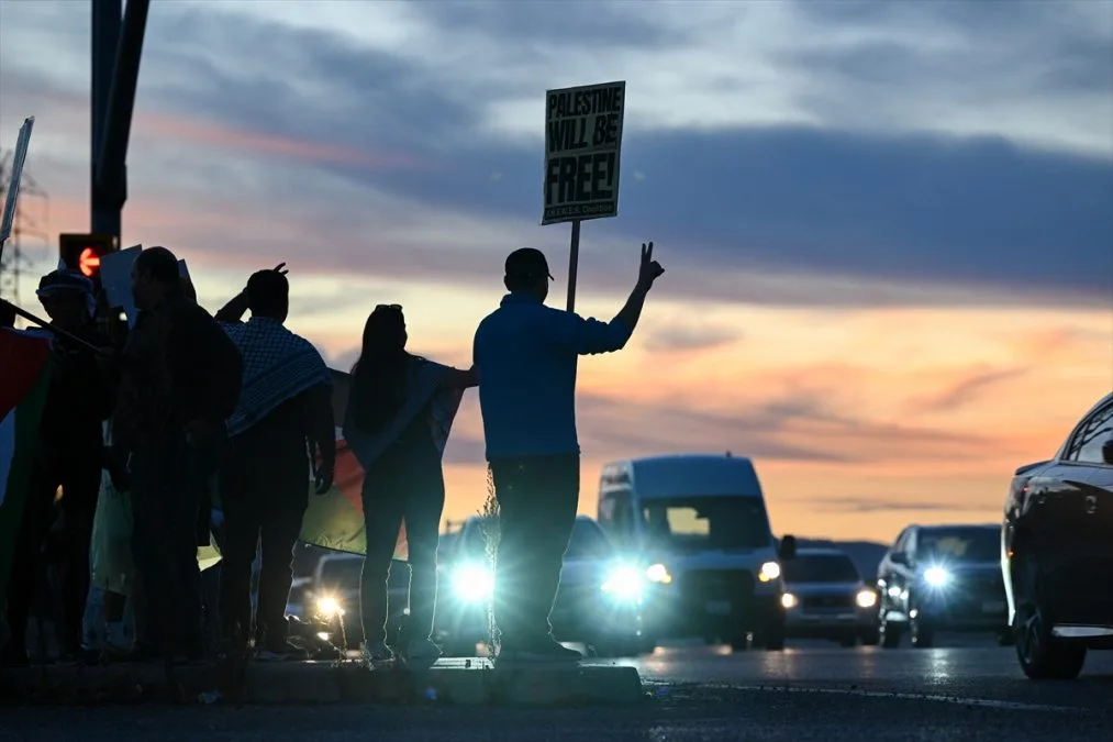 Noseći transparente i palestinske zastave u Menlo Parku u Kaliforniji, grupa je uzvikivala slogane “Ne možete sakriti da vas optužujemo za genocid”.