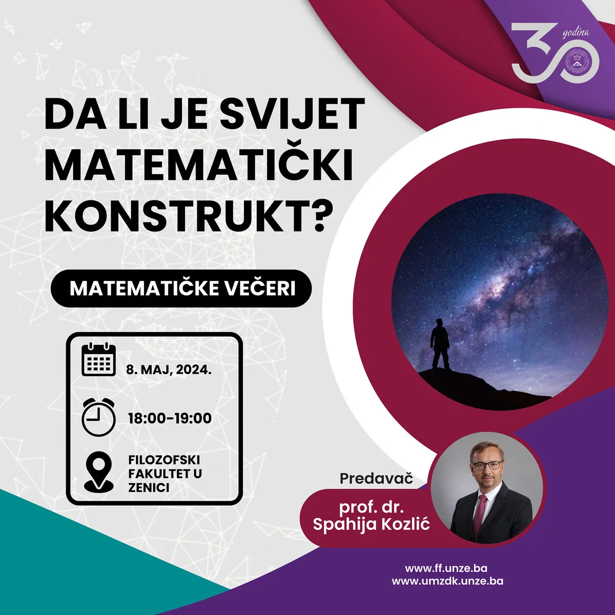 Na trećoj matematičkoj večeri, povodom obilježavanja 30 godina postojanja Filozofskog fakulteta a u organizaciji studijskog programa Matematika i informatika, održat će se predavanje “Da li je svijet matematički konstrukt?”.