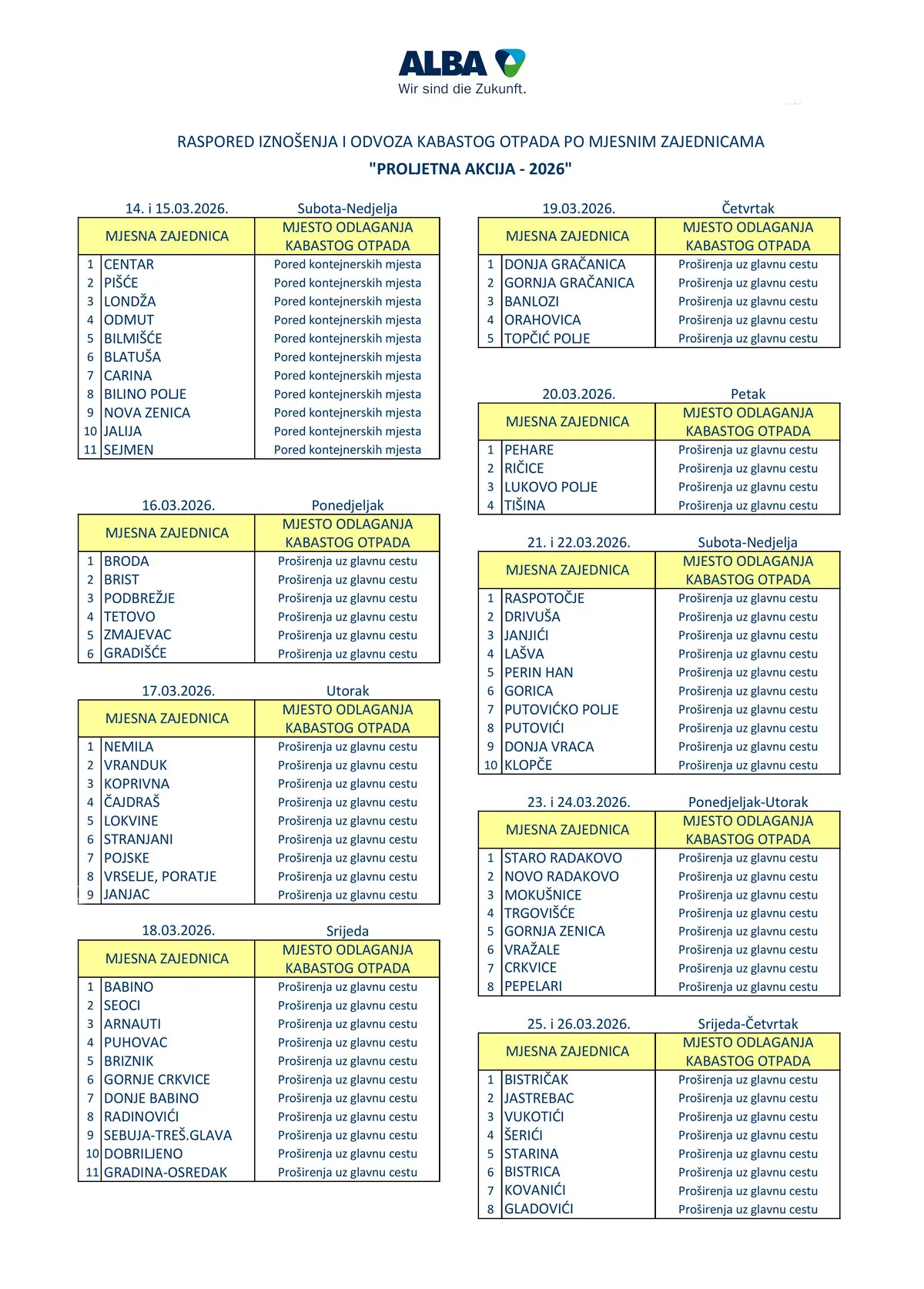 Preduzeće “ALBA Zenica” d.o.o. Zenica obavještava građane, cijenjene korisnike svojih usluga, da će se u periodu od 14.03 – 26.03.2026. godine vršiti prikupljanje i odvoz kabastog otpada po mjesnim zajednicama u općini Zenica, u kojima je uspostavljen sistem organizovanog odvoza otpada, prema prethodno utvrđenom rasporedu.