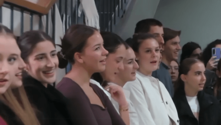 Na snimku objavljenom na zvaničnoj Facebook stranici JU Prve gimnazije Zenica vidi se kako zajedničkim glasovima i aplauzom prisutni odaju počast omiljenom pjevaču.