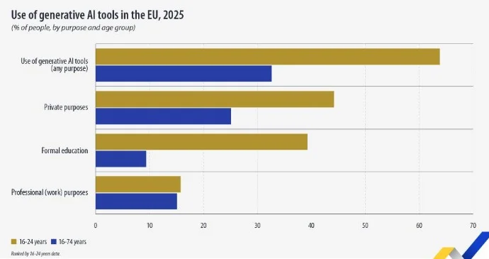 U 2025. godini čak 63,8% mladih u dobi od 16 do 24 godine u Evropskoj uniji koristilo je alate zasnovane na generativnoj vještačkoj inteligenciji (AI).